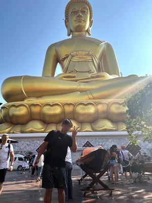 またまたやってきました。今回はいつも以上にハードスケジュールです。ゴルフを5ラウンドプレーして、寺院巡りで心の浄化作戦です(^^)/ 今回もゴルフ場は現地の日本人の知り合いの社長に押さえてもらい、寺院巡りは現地の方にお任せしました。ワット・パクナムの金色の巨大仏像に手を合わせて、お祈りもばっちりです! タイの国民性ですが、国王や大統領や神様をすごく大事にしており、軽率な事を言ったりすると本気で怒られます(^^;) 心も浄化され日本に帰ってもバリバリお仕事頑張れそうです😁